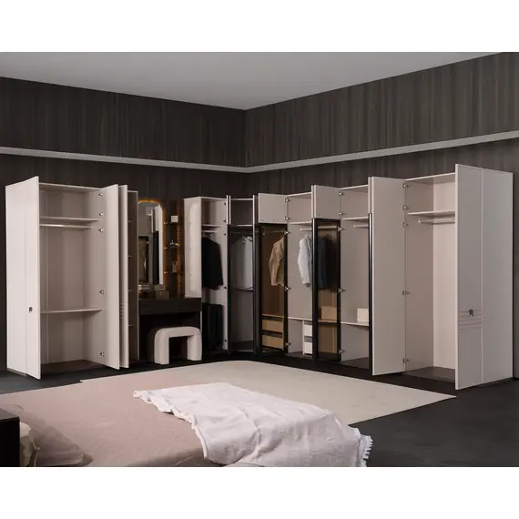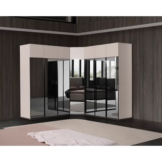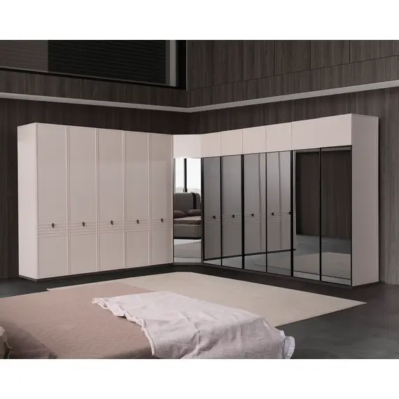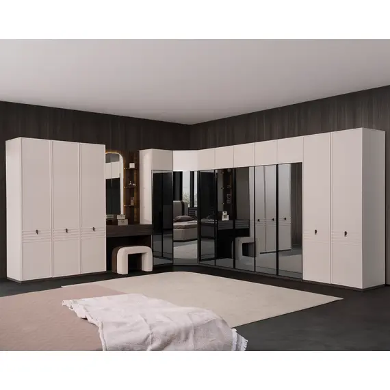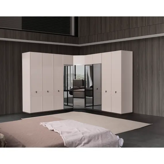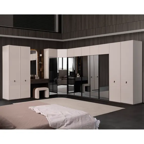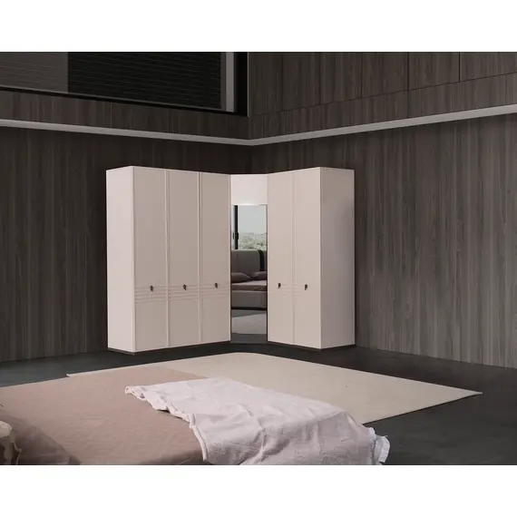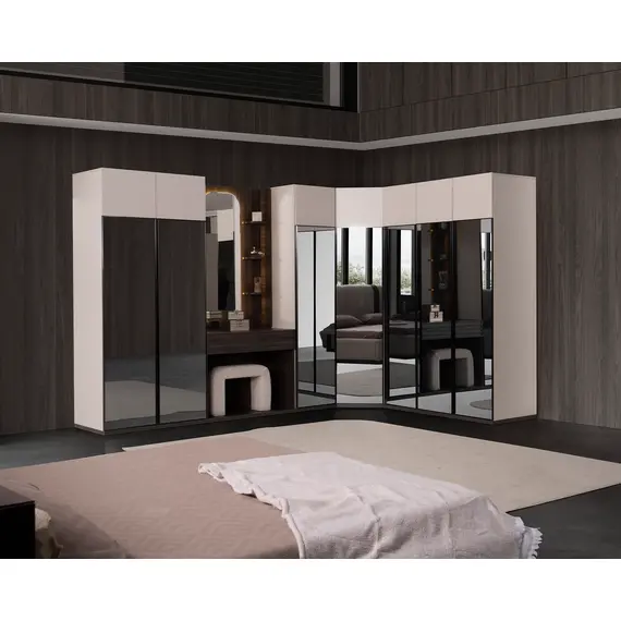 (سرير 180*200 + دولاب زاوية 5 قطع  + 2 كمود + شفنيرة اكسسوار  + تسريحة بقلب الدولاب + بف )