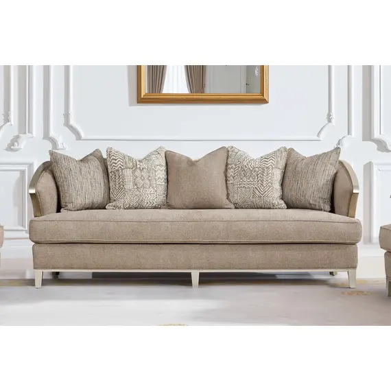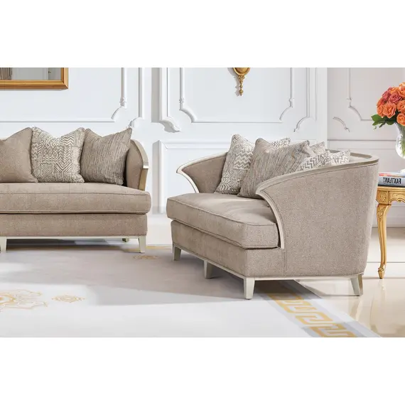 يأتي بتنجيد فاخر بلون بيج غامق يضفي على المكان إحساساً بالدفء والرقي، مع لمسات من الخشب المنحوت بلون لون الشامبين وهو لون ذهبي شاحب ودافئ، مزيج بين الأصفر والبرتقالي خفيف تعكس الفخامة في أدق التفاصيل
