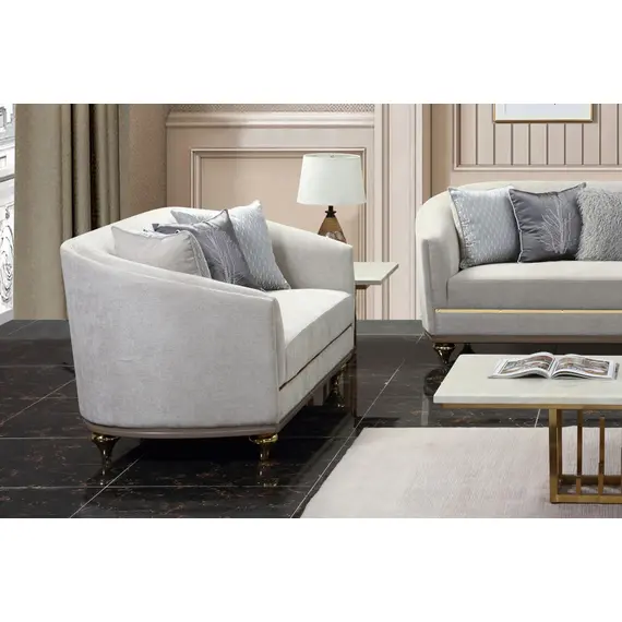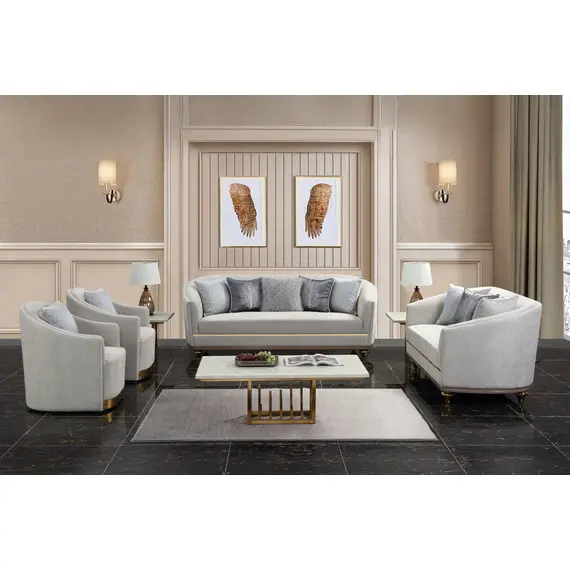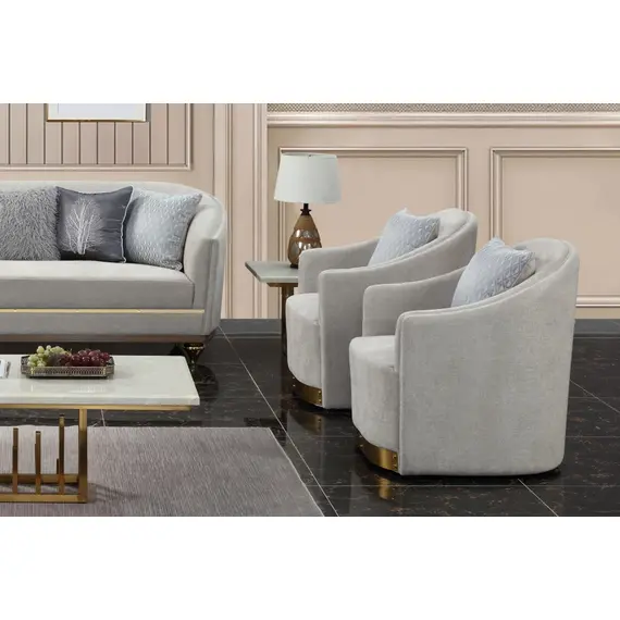 يأتي بتنجيد فاخر بلون بيج رمادي يضفي على المكان إحساساً بالدفء والرقي، مع لمسات من الخشب و المعدن، مزيج بين الرمادي والذهبي بالمعدن تعكس الفخامة في أدق التفاصيل